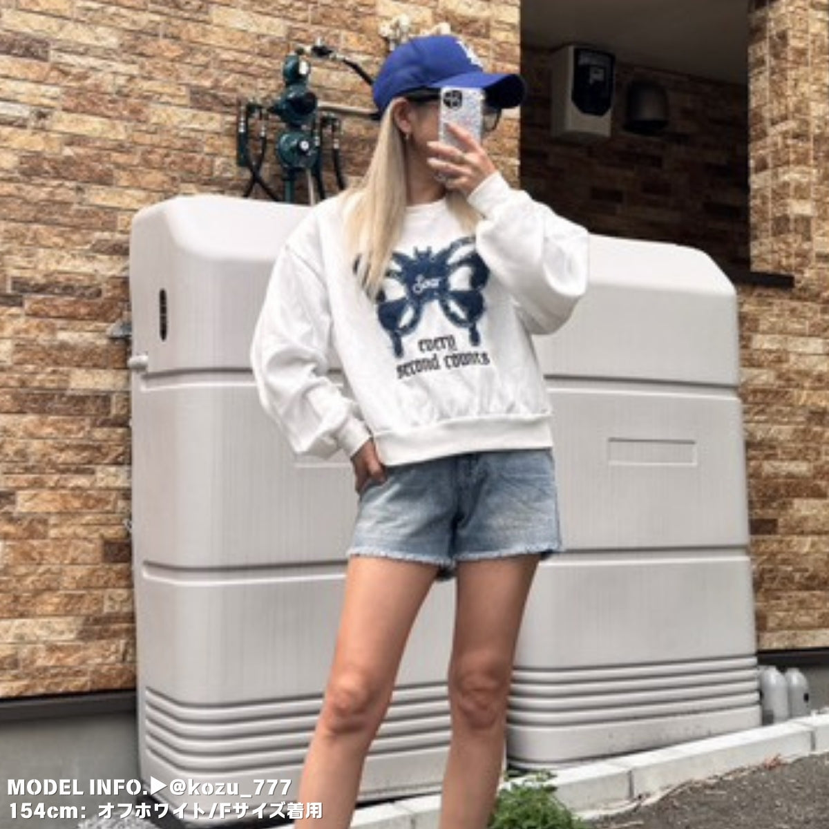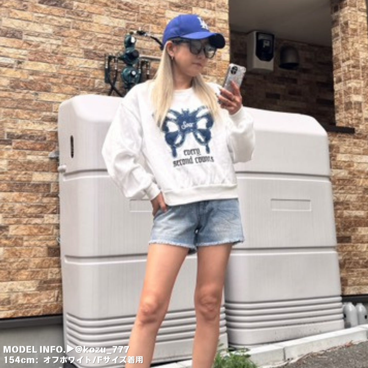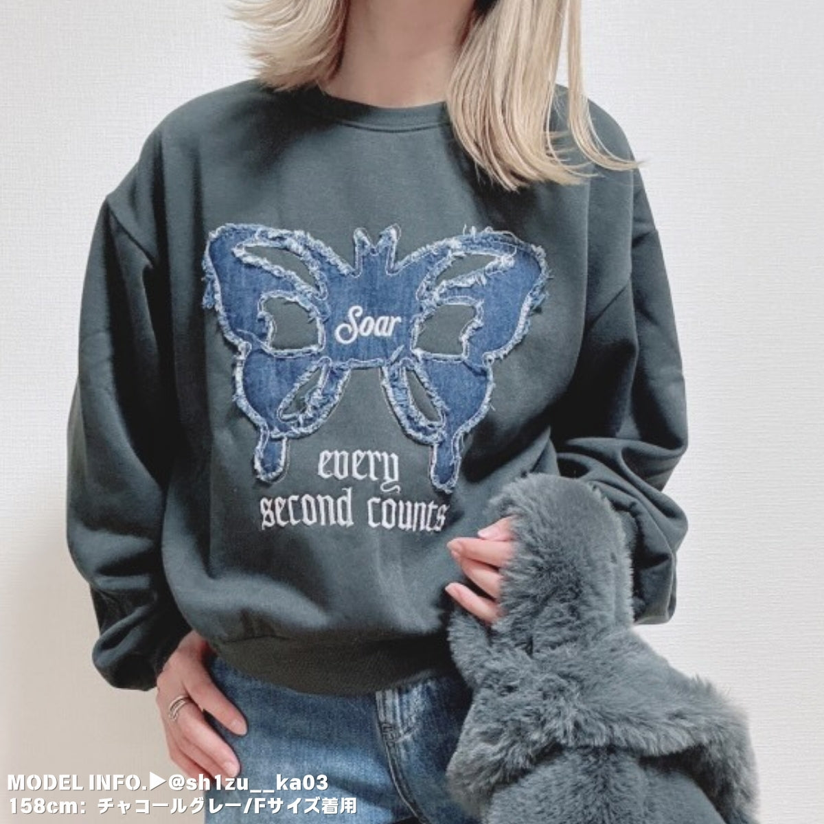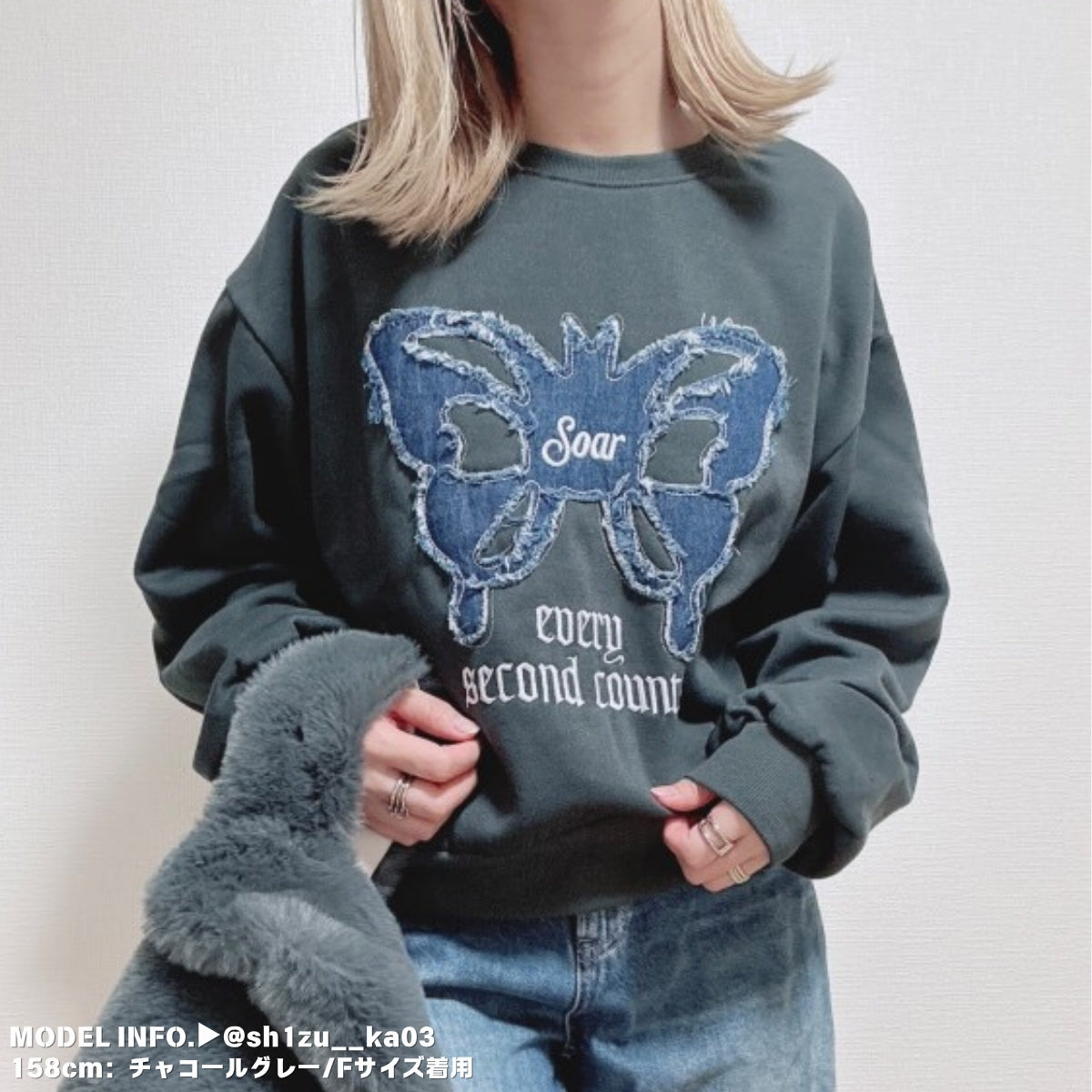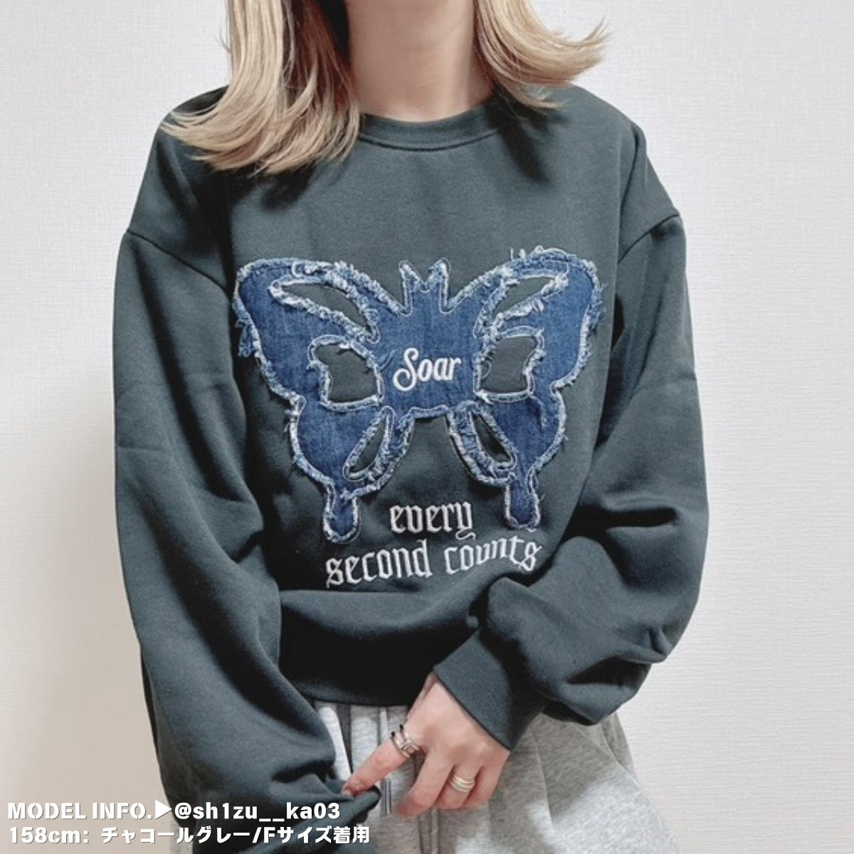 -立体的なバタフライモチーフが目を引く裏起毛トレーナー