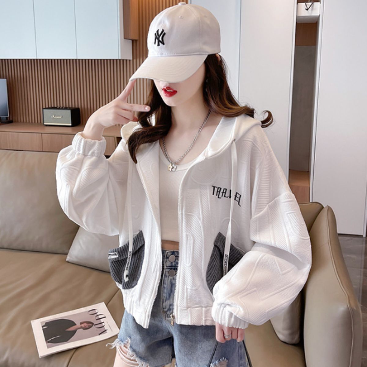 -韓国ストリート風!さりげないロゴデザイン、配色ポケットが映えるジップアップフーディー