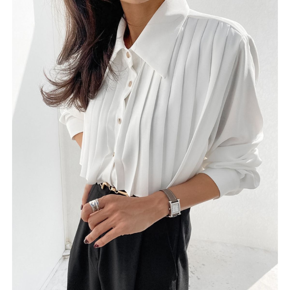 -繊細プリーツが上品に映える大人ブラウス。
