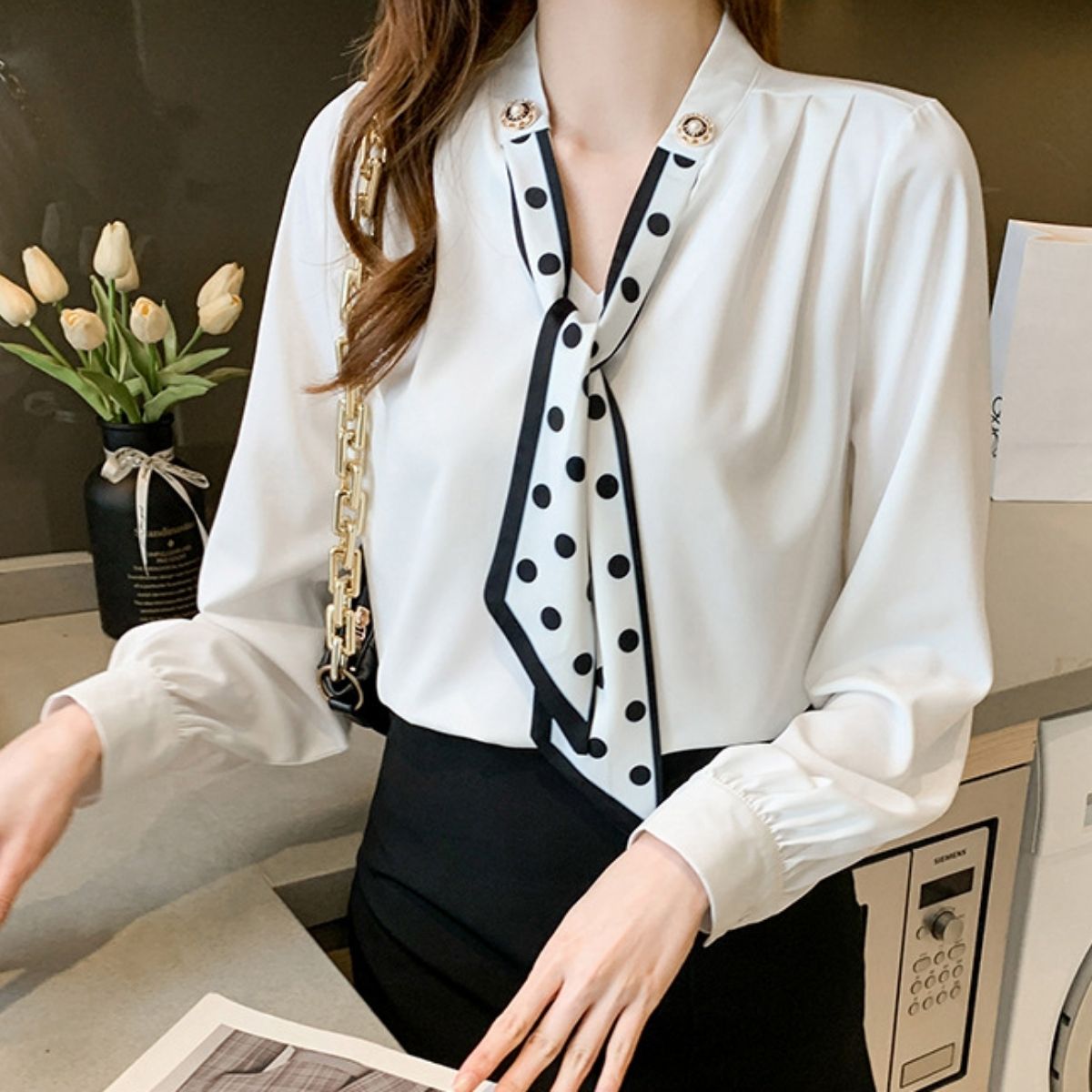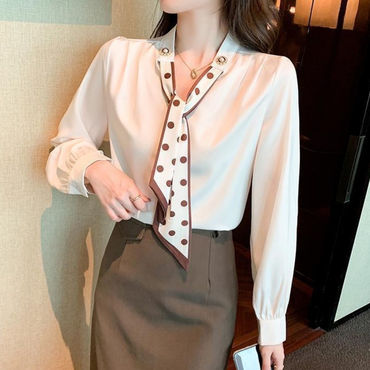 -ドット柄スカーフタイが華やかな印象に。通勤にも使える上品ブラウス。