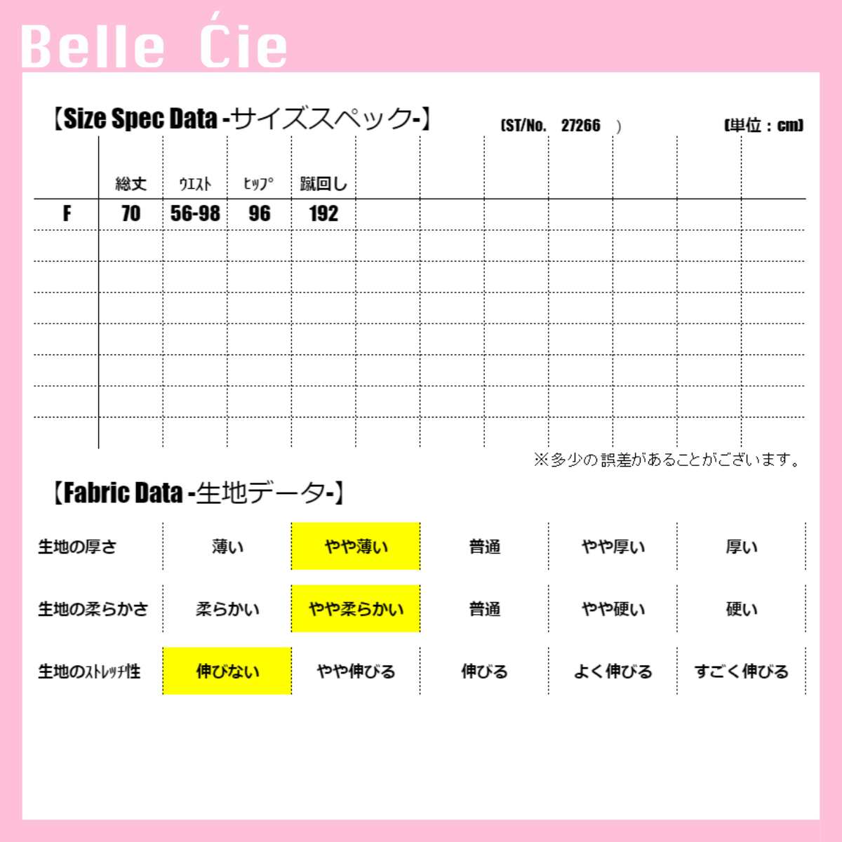 【F】:総丈70 ウエスト56-98 ヒップ96 蹴回し192