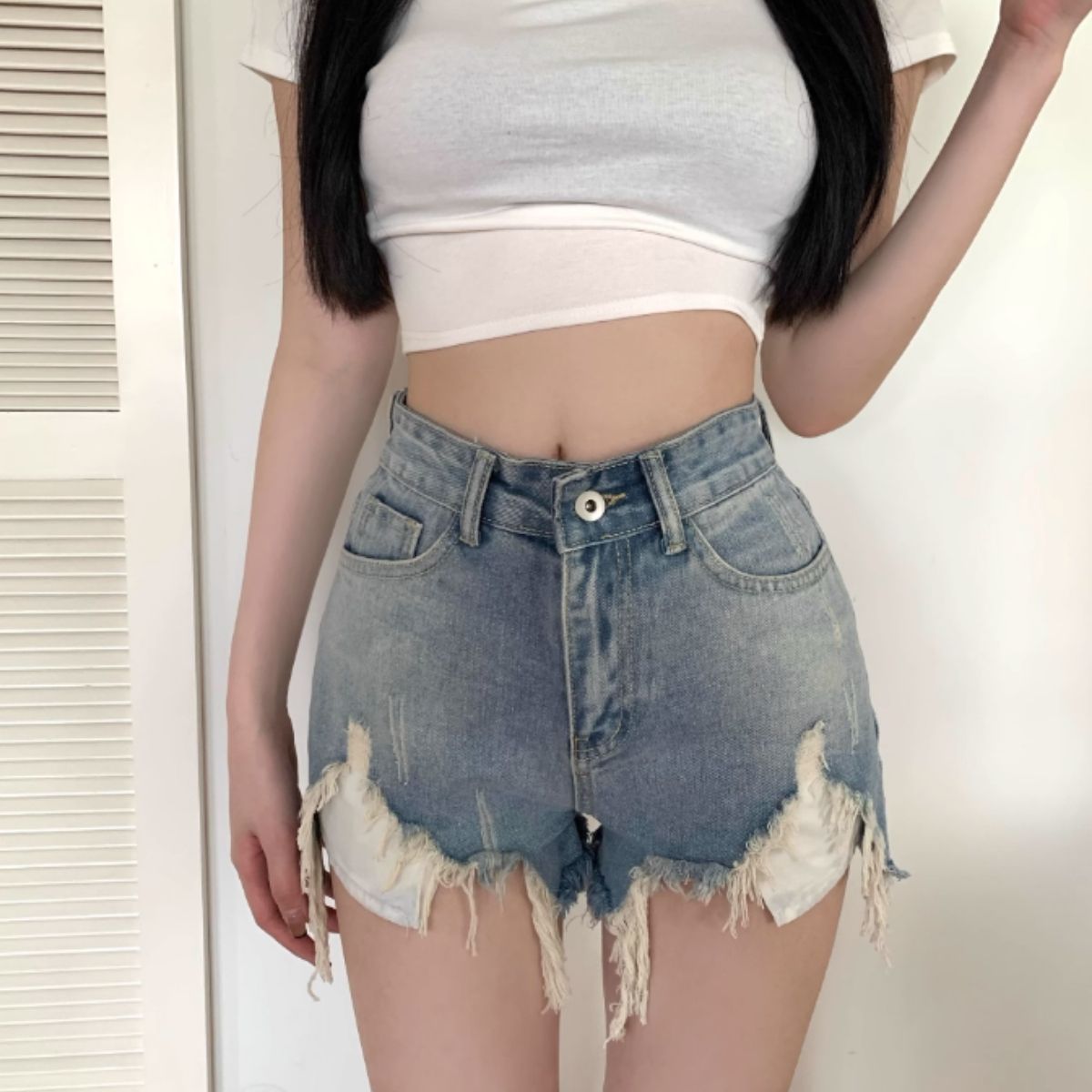 -短めの丈が脚を長く見せ、夏に着こなしたいセクシーデザインのデニムパンツです。