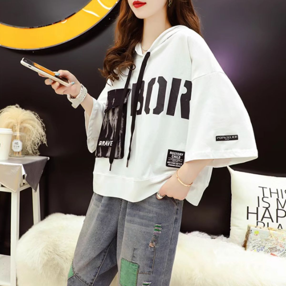 #ヒップホップ、#体形カバー、#半端袖#ポケット、#ビッグシルエット、#大きめ#かっこいい、#白